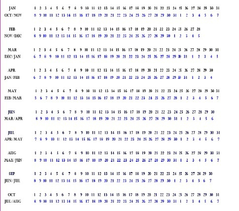 以下表為例:最後月經日是1月1日,預產期就是10月8日(上下相對應數字)