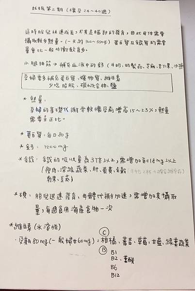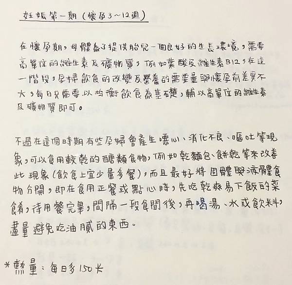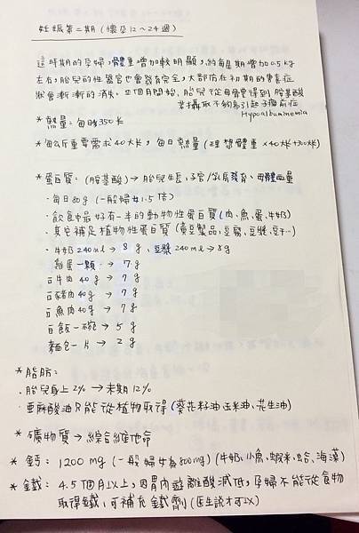 孕期三階段需補充的營養不太一樣,營養都需要均衡 (初期) 注重葉酸、維生素、礦物質;(中期) 蛋白質、礦物質、鈣、鐵;(後期) 蛋白質、礦物質、鈣、鐵、碘、水溶性維生素。