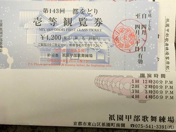 二等席券 2,000 yen,茶卷500 yen ,東山區宮川筋四丁目306