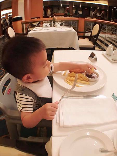 登船第一日晚餐時間,餐點比想像中好吃很多耶!薯條沾牛肉醬是艾立的心頭好。我最愛的是綠豆薏仁蓮子涼湯,連點了兩晚晚餐 好Q清甜。