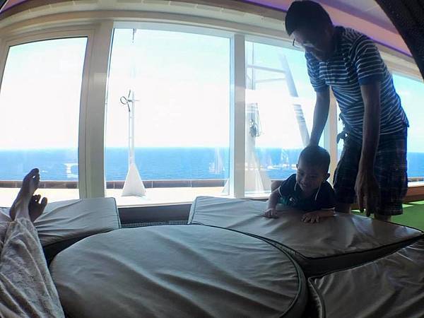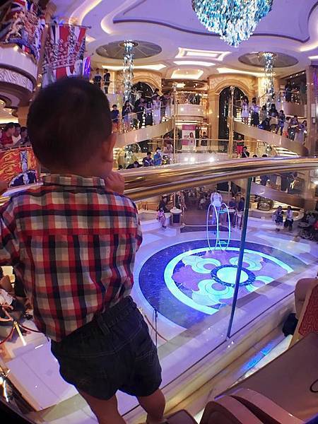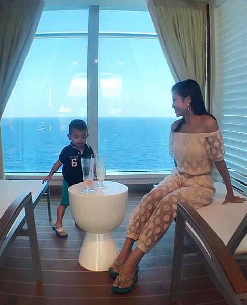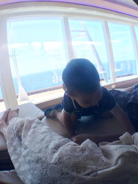 沒想到第一次在遊輪上曬著太陽,讓他看看別的小朋友穿戴的各式游泳圈,他也肯戴了。最後還一直玩水、游各種姿勢到不肯離開... (汗顏的媽咪