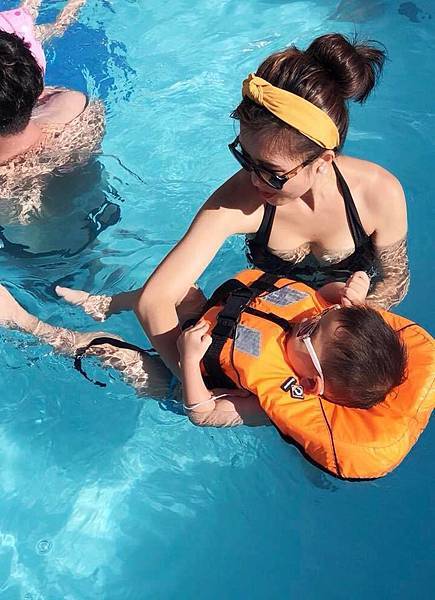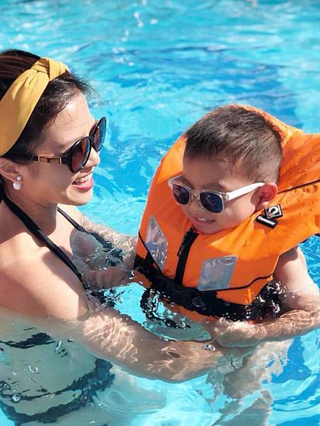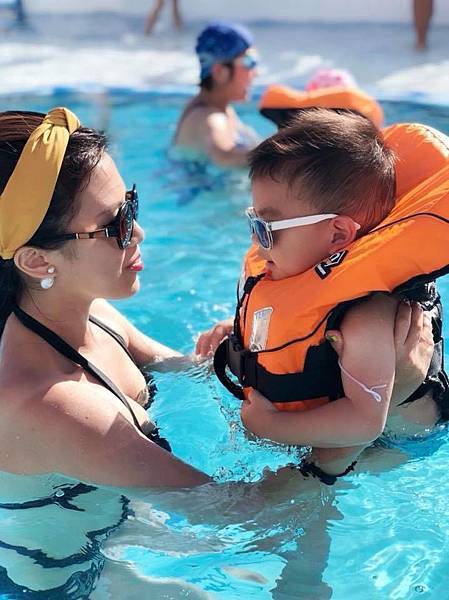 寶寶一下子就愛上橘色游泳背心,其實他以前在我們家的社區游泳池因為是室內的,他有點怕水、除了比較冰還不肯穿游泳圈。
